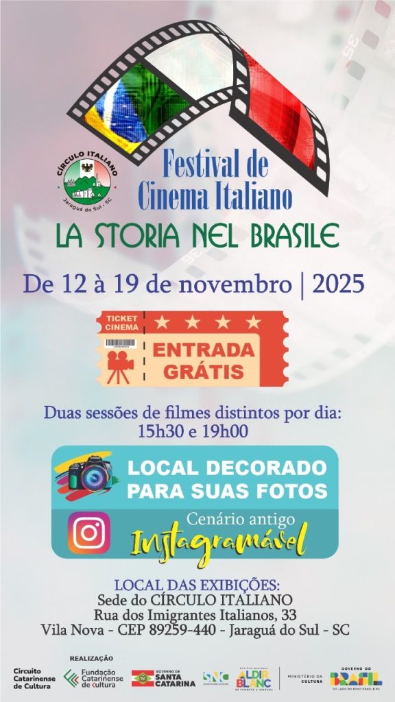 A comunidade italiana está em festa em Santa Catarina. Em alusão aos mais de 150 anos da imigração no Brasil, o Círculo Italiano de Jaraguá do Sul promove, nos dias 12, 13, 14, 17, 18 e 19 de novembro, o Festival de Cinema Italiano: La Storia nel Brasile — um tributo emocionante aos mais de 150 anos da imigração italiana no Brasil. Com entrada gratuita, o evento vai oferecer duas sessões diárias, uma às 15h30 e outra às 19h, e promete transformar a cidade em um cenário de arte, memória e celebração cultural.